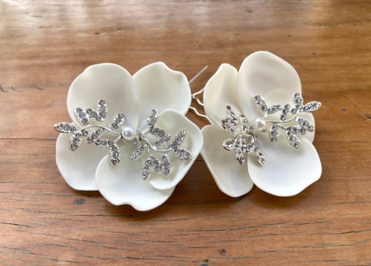 Pin/ grampo com flor de porcelana off white . O detalhe do miolo é em pérola e galhinhos prata com strass. Brilha muito! Mede aproximadamente 6,5 cm . Valor por unidade.