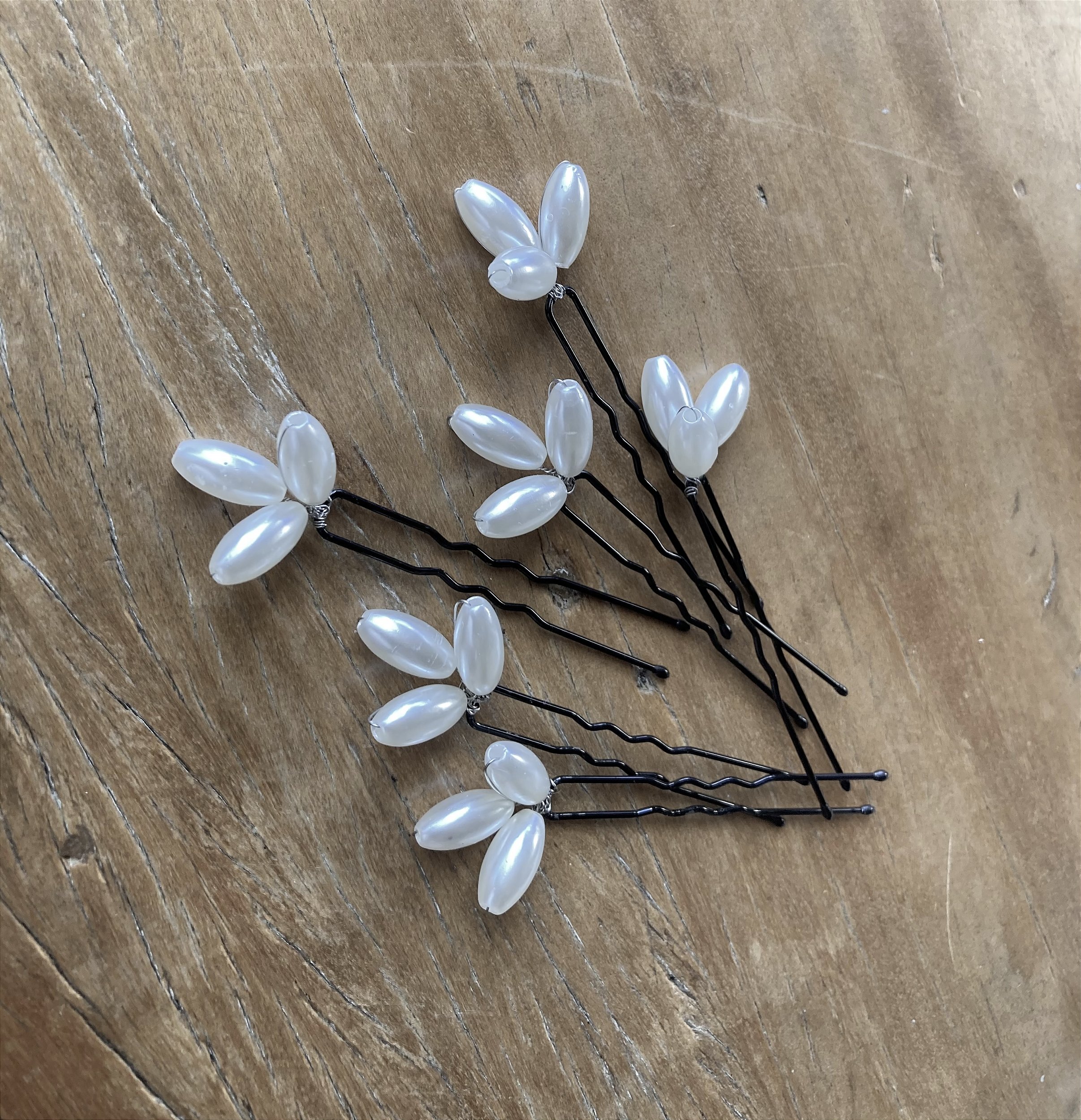 Conjunto de 6 grampos com 3 pérolas tipo arroz em cada . Versáteis, podem ser aplicados em qualquer penteado.
