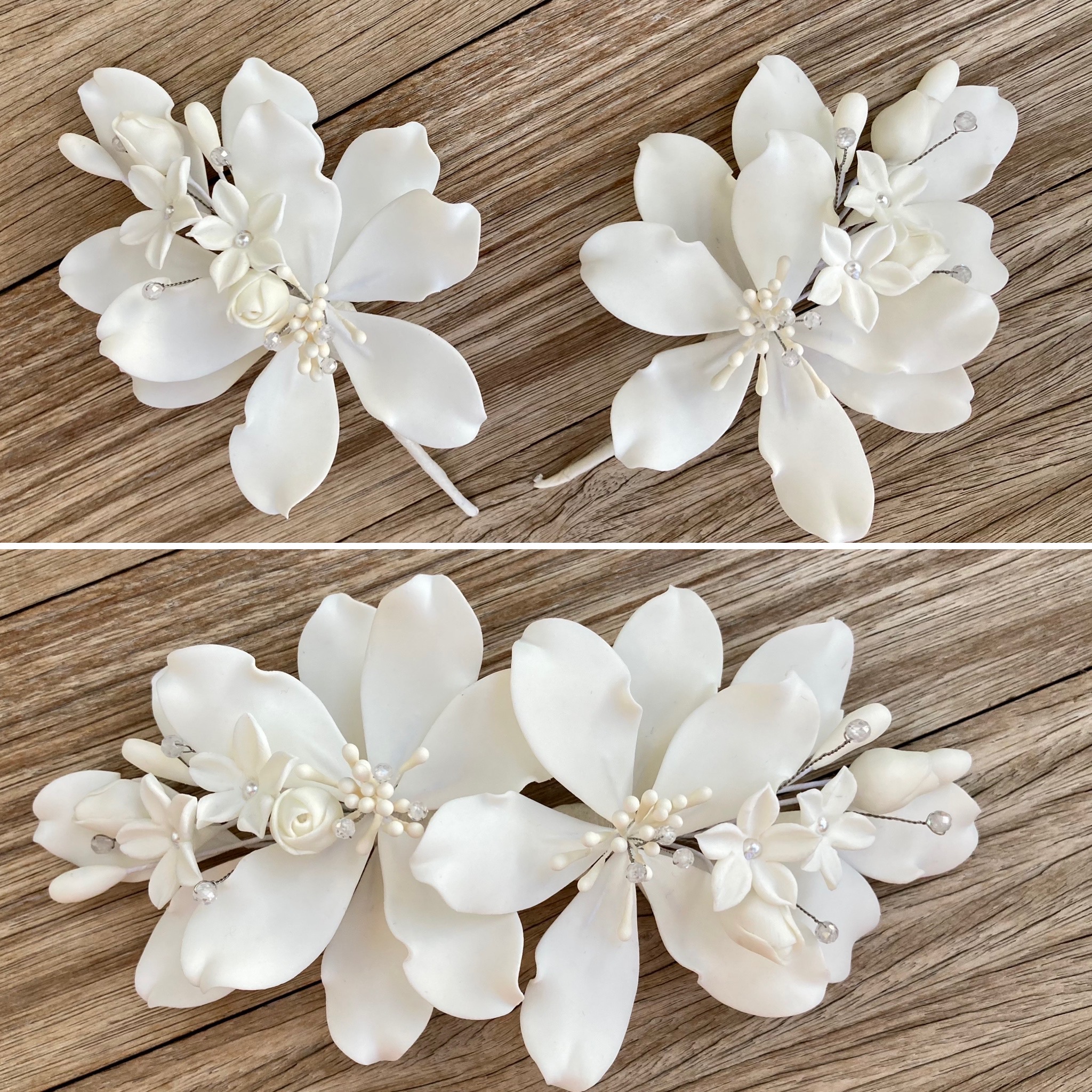 Conjunto de dois Apliques com lírios e folhas em porcelana fria off white. Fica lindo colocar um de cada lado ou juntos, formando um arranjo. Caso queira customizar essa peça, por exemplo; complementar com brilhos e pérolas, ou todo em tom de porcelana perolada , entre em contato com conosco.
