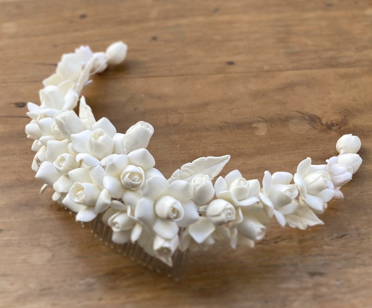 Grinalda em mini rosas moldadas à mão em porcelana fria off white. Pode ser usada de várias formas, inclusive como tiara mesmo. É semi flexível, mede aproximadamente 23,00 cm lineares, a largura má parte central; 5,5cm e a altura máxima 1,5cm .