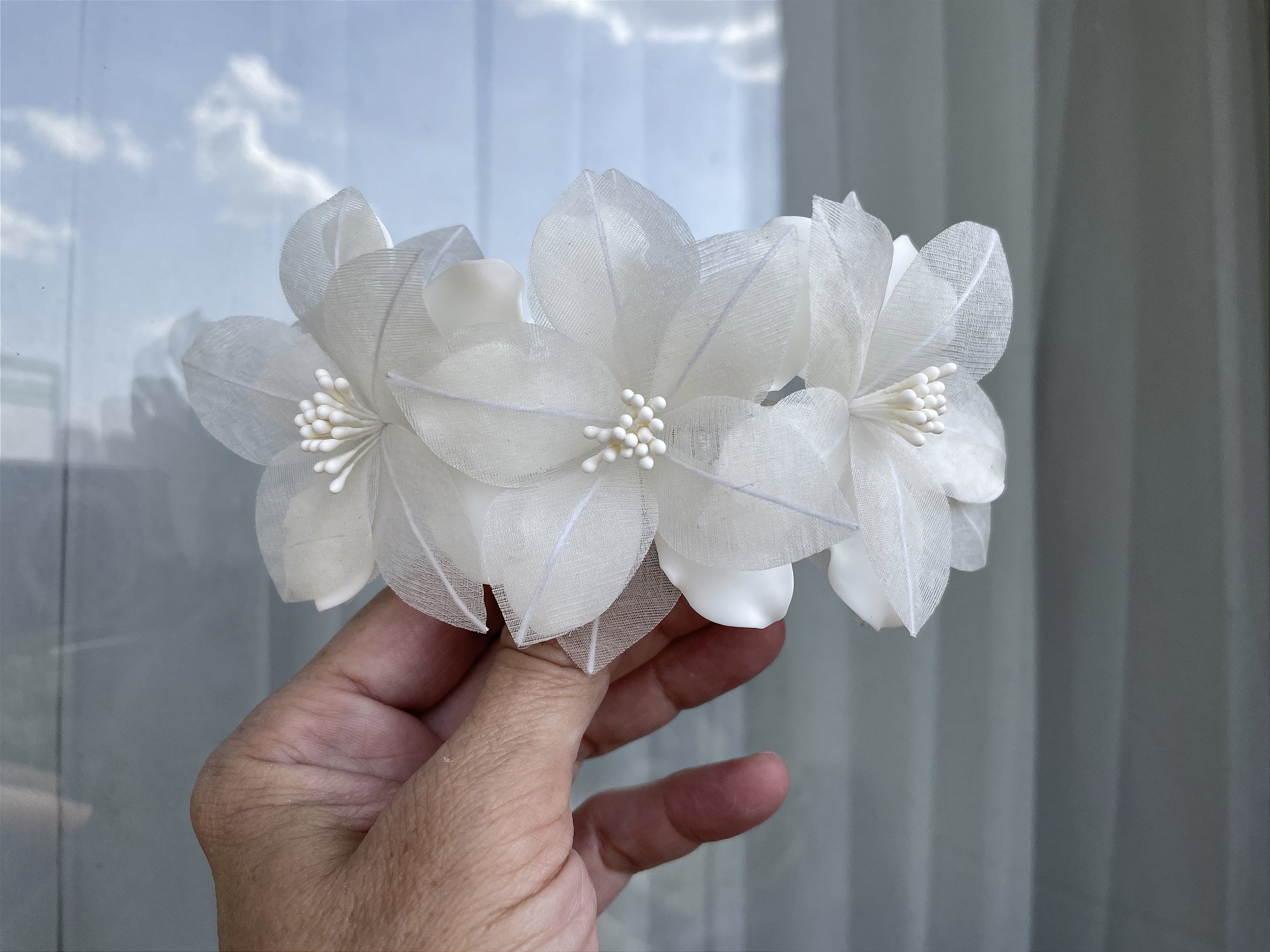 Headpiece composto por três Lirios em porcelana e organza de seda pura. Possui pente para fixar no penteado. Largura aproximada: 6cm