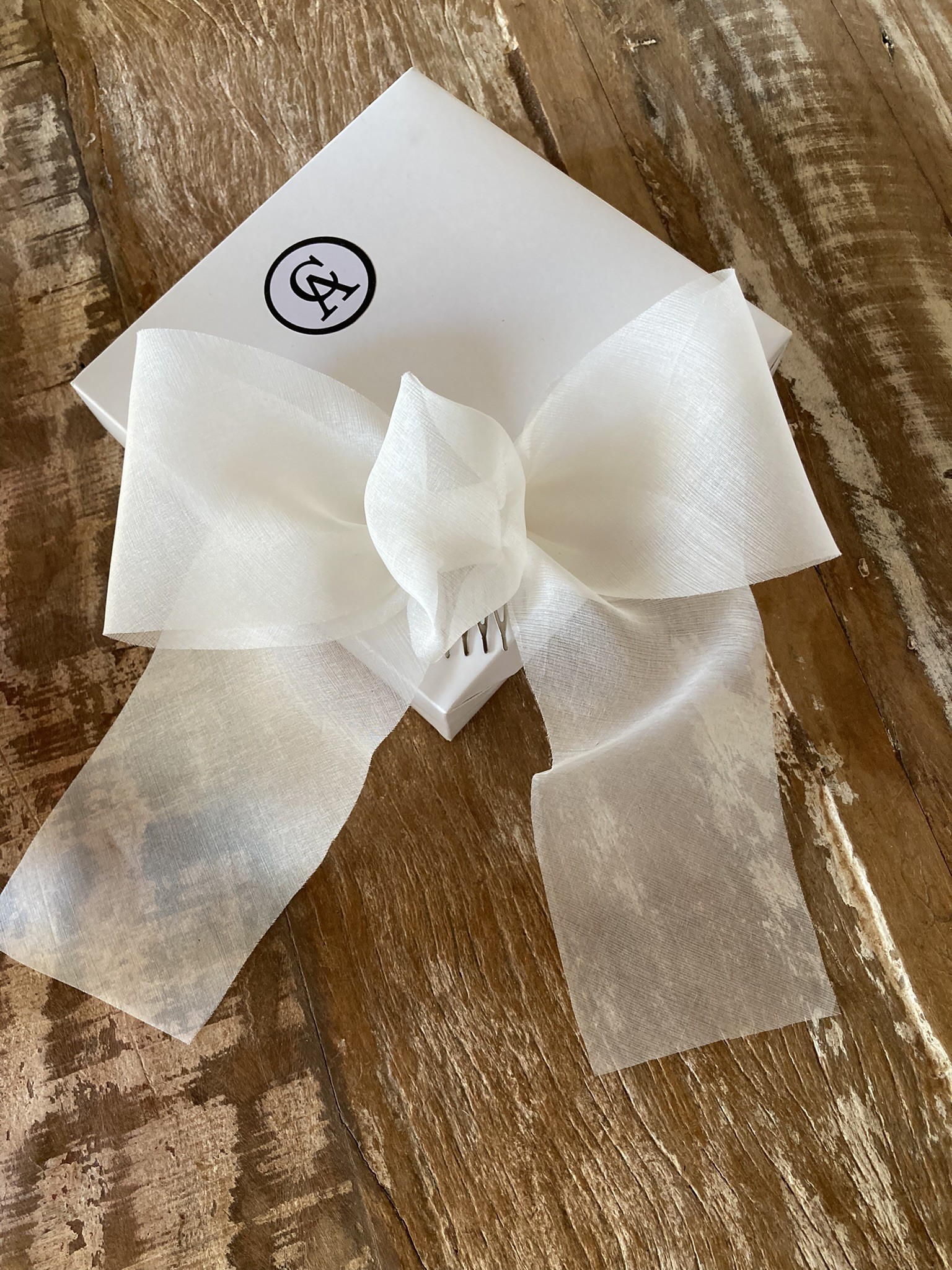 Laço em organza de seda pura. Lindo! Possui um pente para fixar . Mede 19 cm x 20 cm. Fazemos em outras medidas. Consulte!