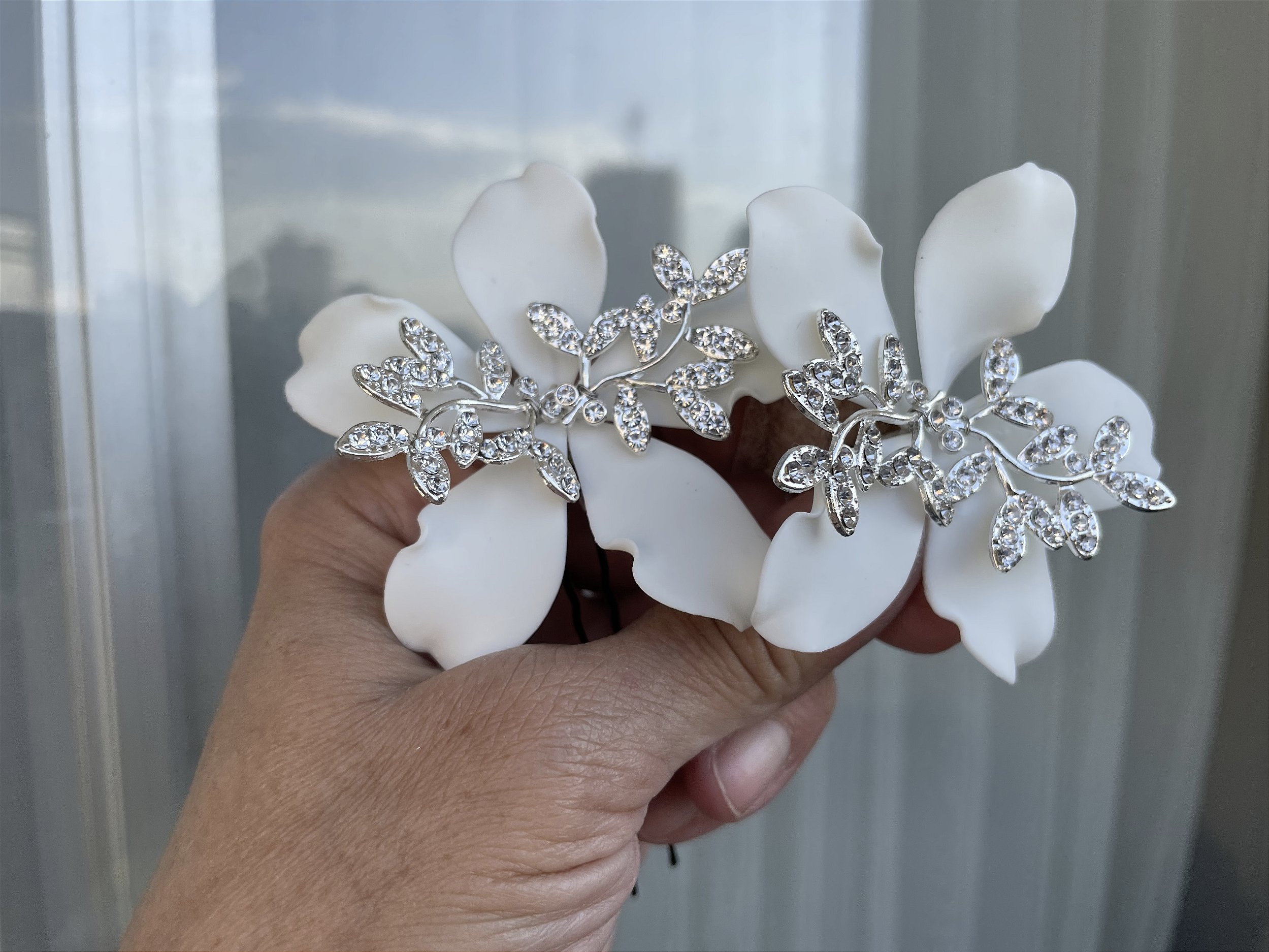 Lírio em porcelana com detalhes em prata com cristais que dão um brilho lindo! Mede aproximadamente 7cm de diâmetro. Grampo tipo Pin, prende facilmente em qualquer penteado . Valor por unidade.