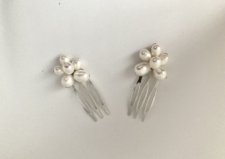 Conjunto de dois Mini Pentes com pérolas naturais de água doce. A flor de pérolas mede 2,00 cm de diâmetro.