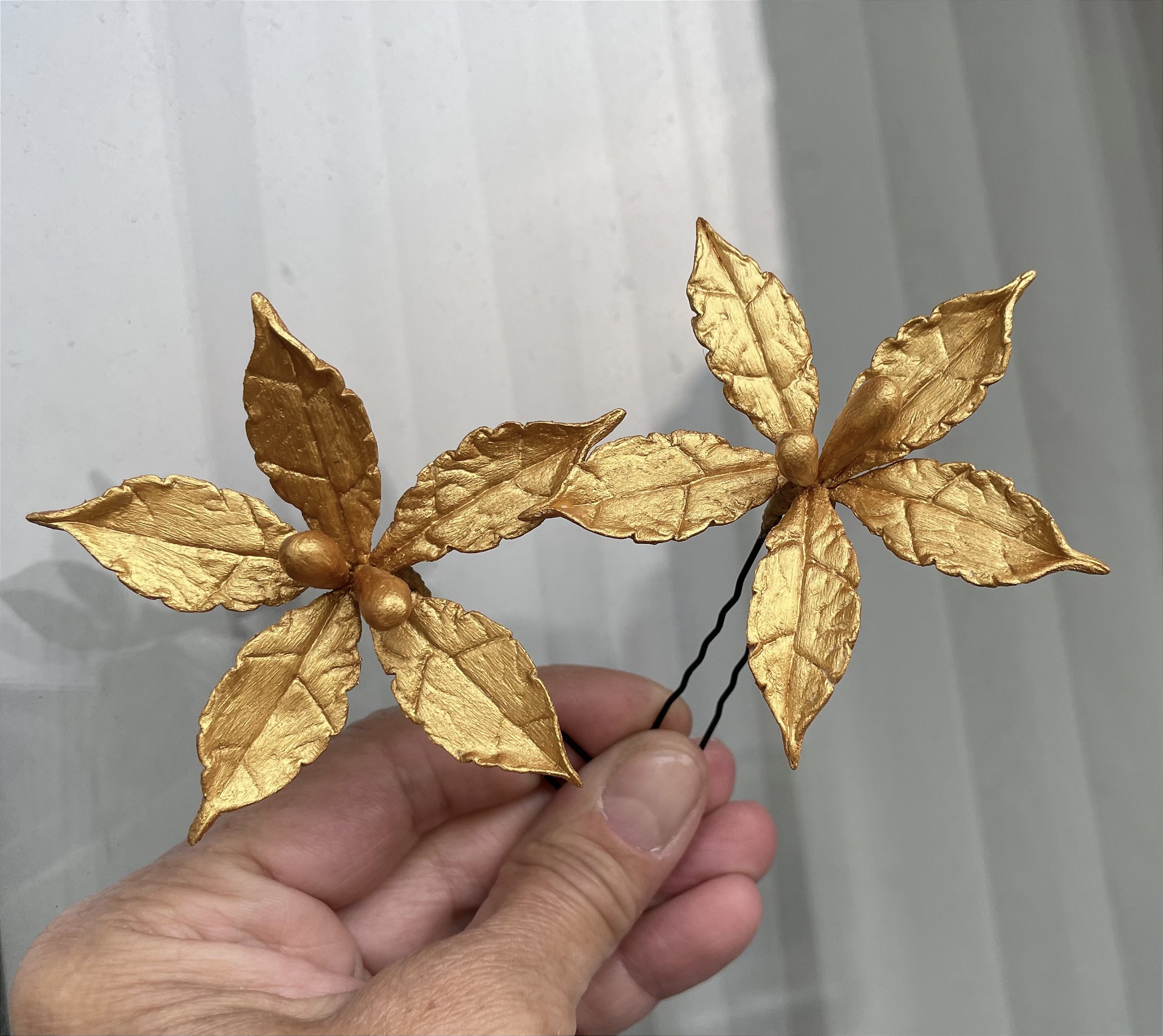 Grampo com flor estilizada em porcelana fria, dourada lindo para salpicar no penteado. Medem aproximadamente 7 cm de diâmetro. Valor corresponda a 2 flores