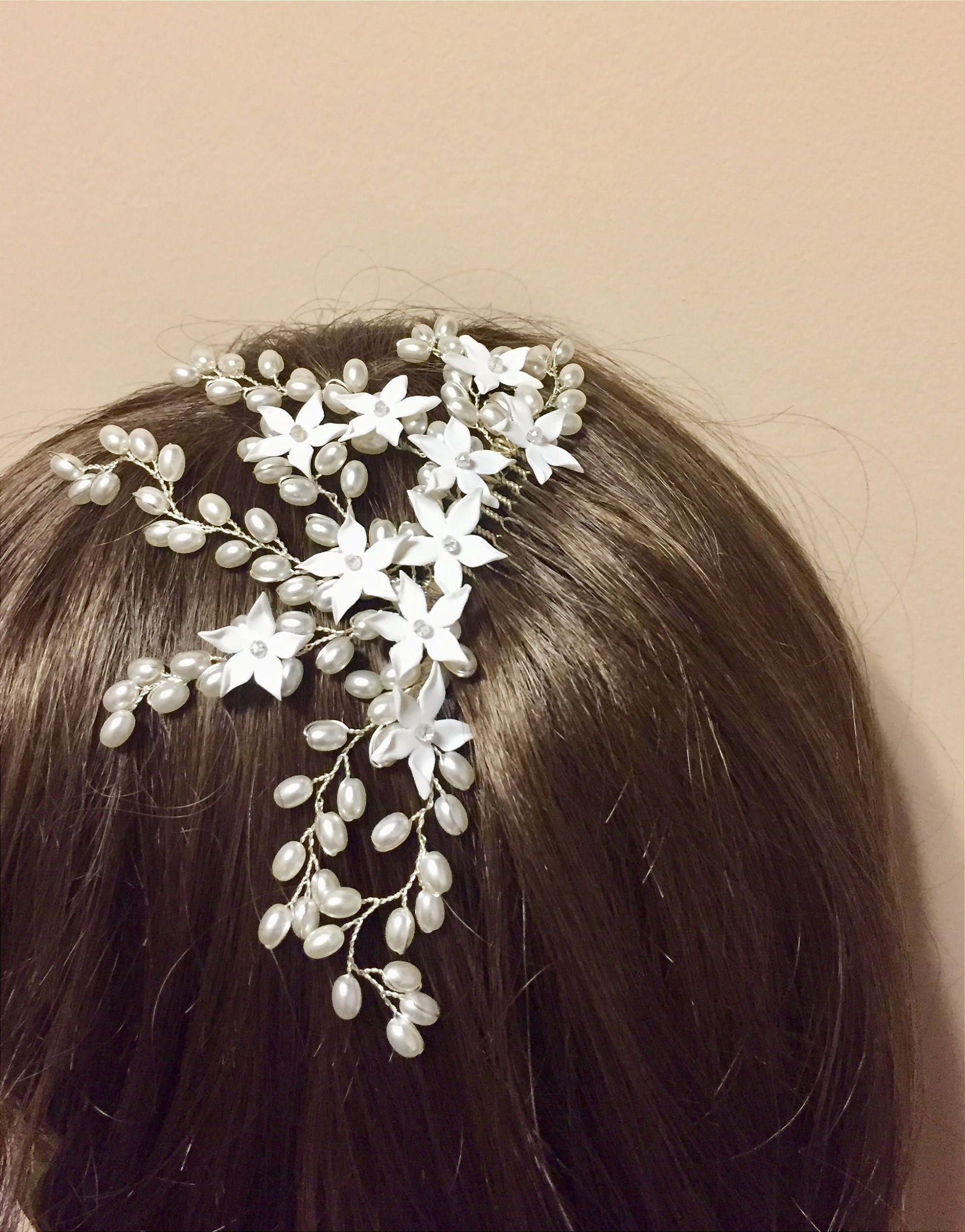 Pente em pérolas e flores de porcelana fria com pequenos cristais. Fica lindo no penteado!