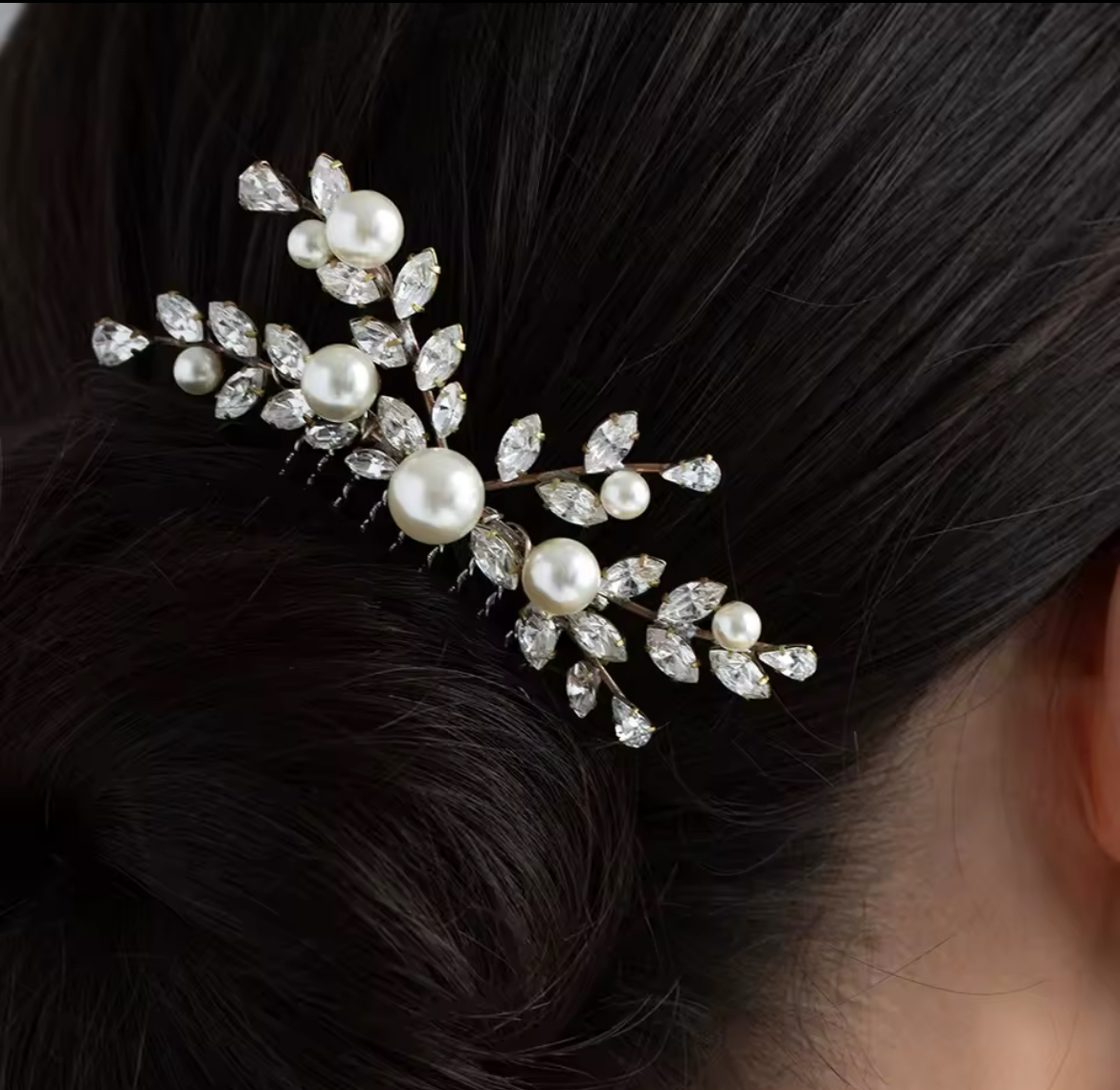 Um lindo, brilhante e delicado pente. Todo em perolas e zircônias. Perfeito para seu penteado. Fica ainda mais bonito se usar 2, um de cada lado do coque ou ravi de cavalo. Mede aproximadamente 10 cm de comprimento x 2,5 cm de largura. Metal na cor prata e pérolas na cor branca .( na foto as pérolas parecem mais amareladas mas são brancas)