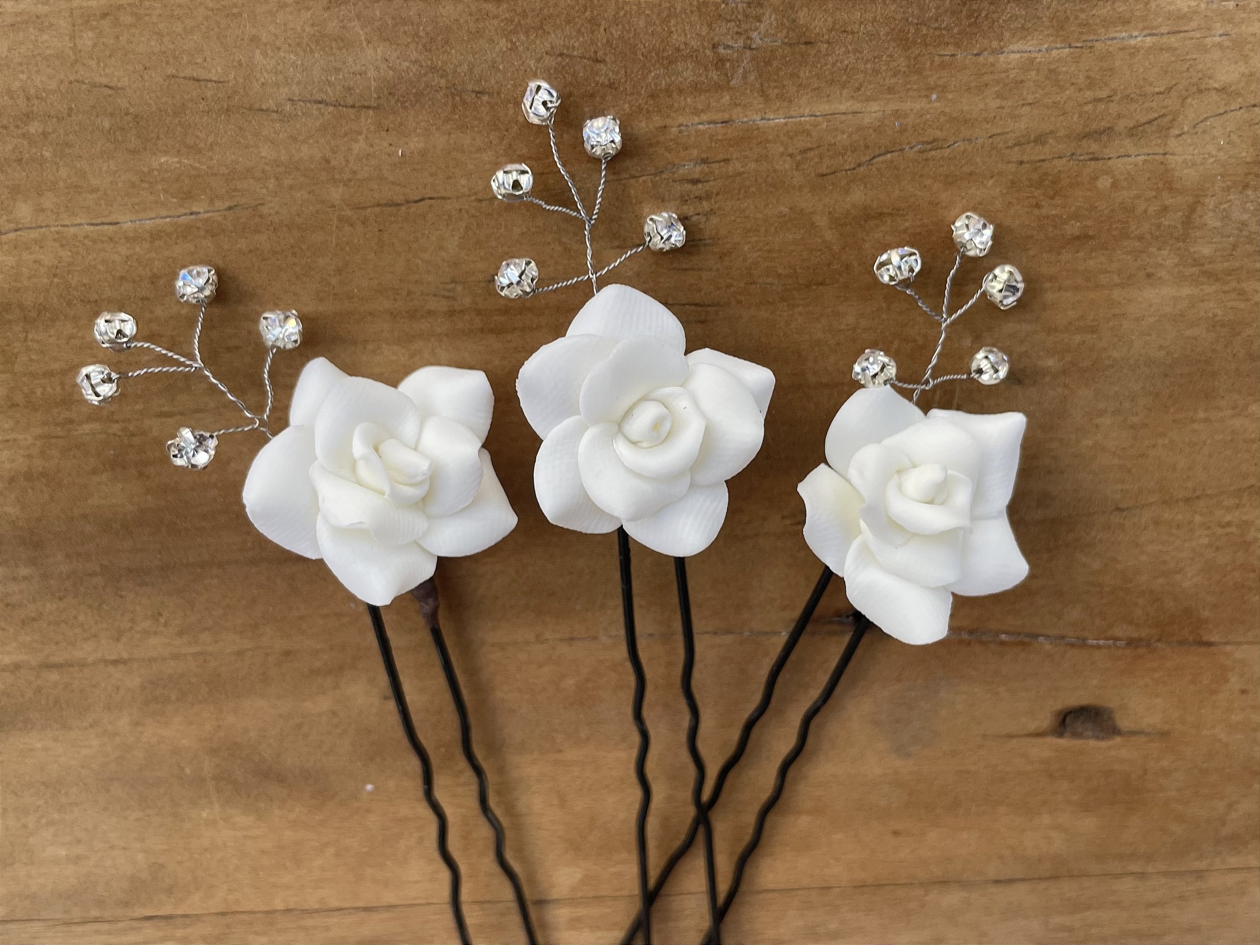 Conjunto de 3 pins com mini rosa em porcelana com cristais. Delicada a rosinha mede 1,00 cm . Ideal para aplicar em todos os tipos de penteado. Valor do conjunto de 3 grampos.