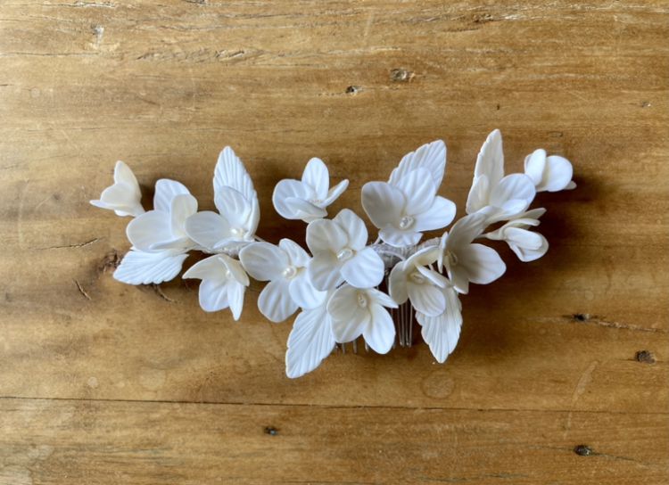Tocado confeccionado em delicadíssimas flores de porcelana fria na cor off white. Uma peça maravilhosa para compor o seu look do grande dia ! Se adapta à todos os penteados. Possui um pente para fixar, mede aproximadamente 19 x 6 cm . Gostou da peça, mas quer customizar? Entre em contato conosco.